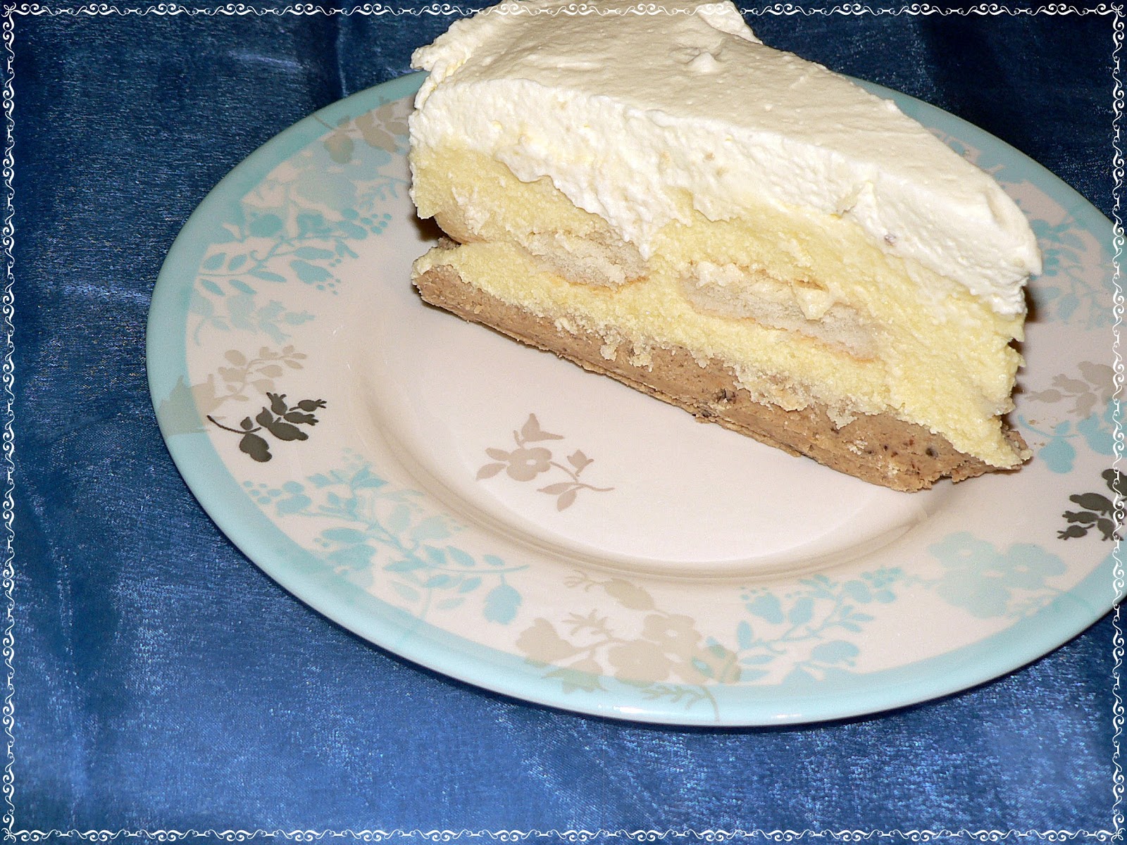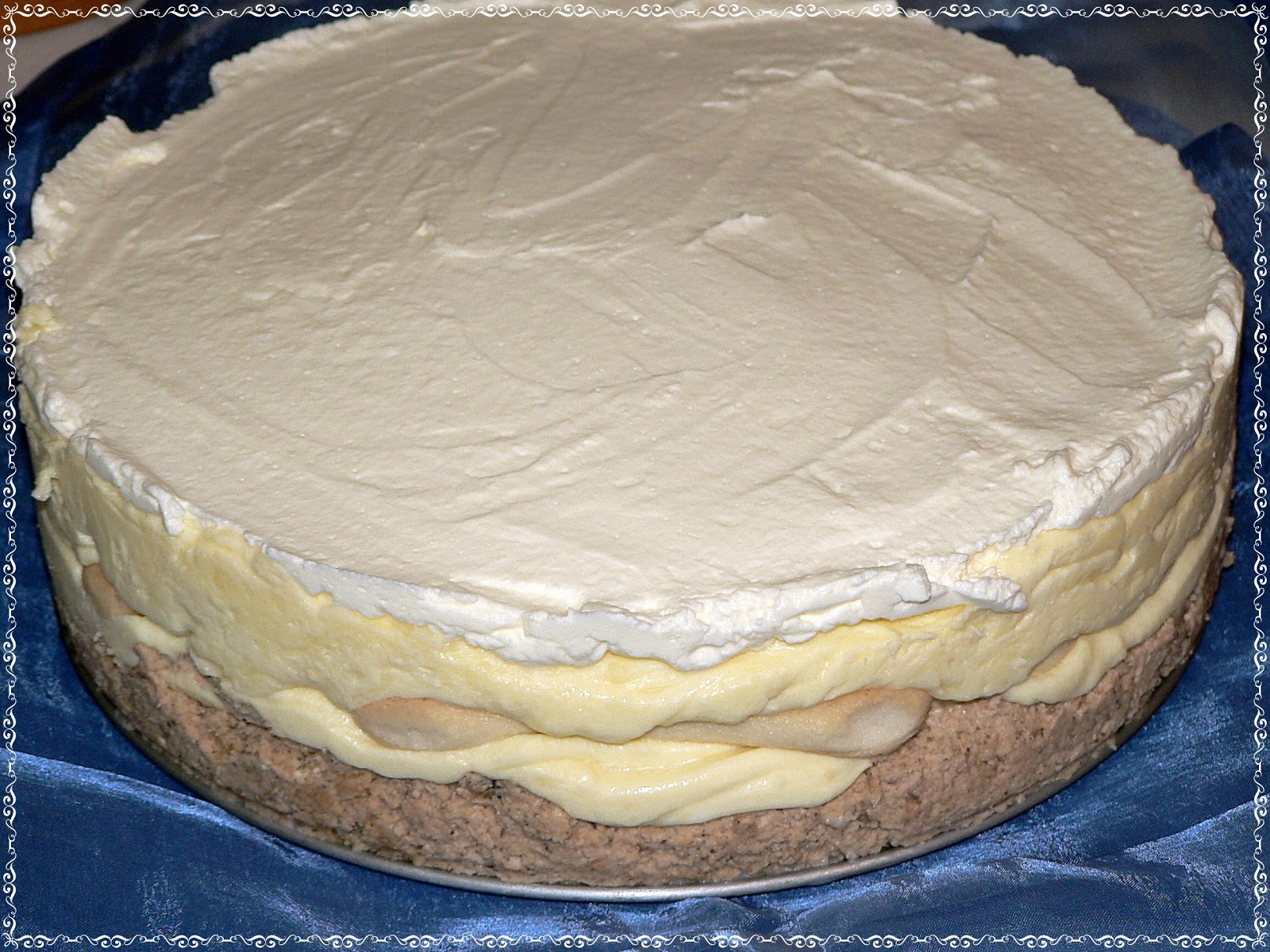 A gesztenyés alap tetejére simítom a pudingos krém felét, a babapiskótát rumost tejbe mártom /nem áztatjuk el!/ és rárakom jó szorosan a pudingkrém tetejére, majd a maradék pudingot a babapiskótás réteg tetejére simítom.